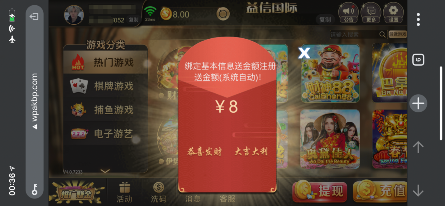 注册完善资料送8元,最低也有8元可以玩游戏