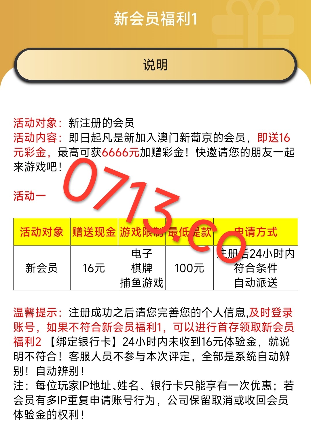 新用户注册绑卡 24小时内自动赠送16元彩金 游戏和提款限制自行查看优惠