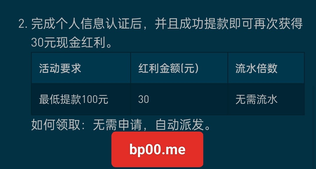 新用户注册绑定银行卡手机号邮箱安全问题自动秒送30元彩金 首次提现成功以后自动再送30元彩金 无游戏限制3倍流水 最低提款100元 之前发过的不过活动改了