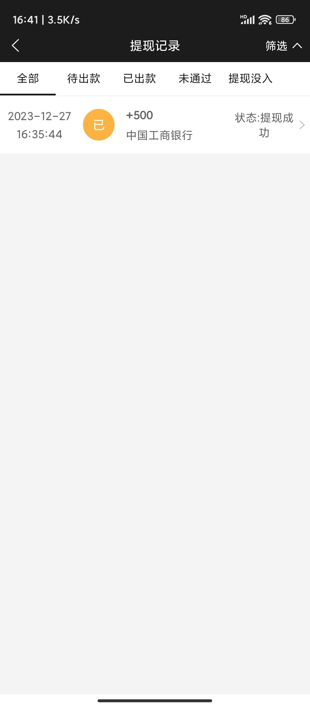 1086提现250不知道给不给 显示提现成功  银行卡没有到账 咨询客服说已经出款了   可能第三方处理吧 ,反正没有冻结账号希望能到吧