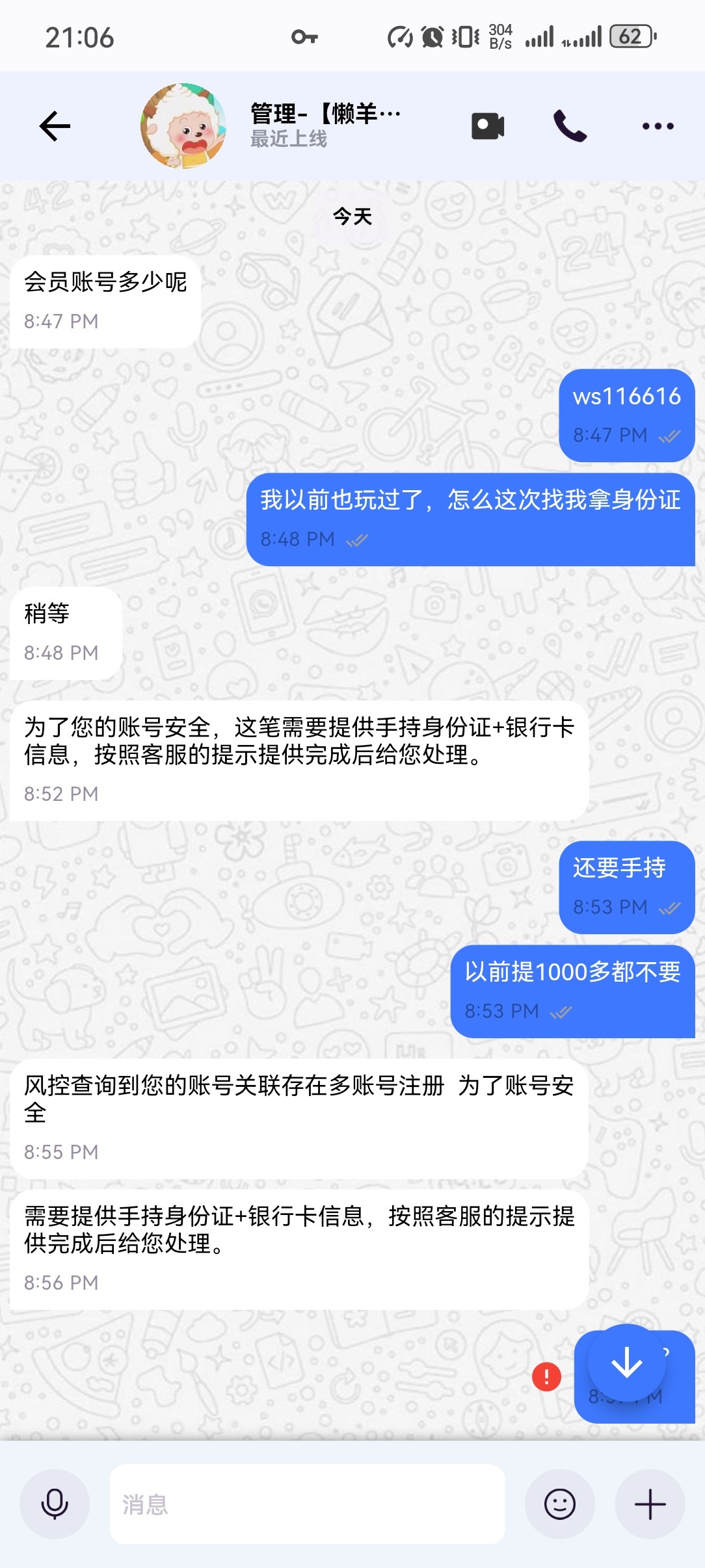 之前也玩过冲了也有几个,前几天打我电话说特邀回归,送了58没发出来,然后自己充值玩了几天,前几天都输完了没提款,今天提款200多块钱不给出要手持身份证,搜了一下历史帖说给完手持就封号没敢给,雷火现在都黑老用户了吗