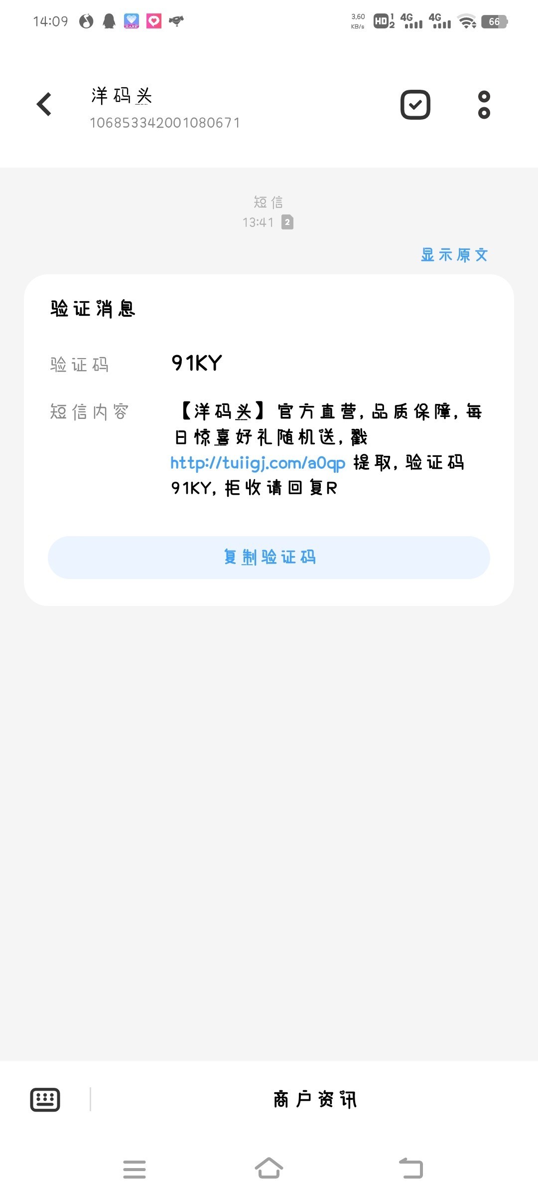 自己看看短信有没有,没有可以试试碰瓷,查手机号!今天来类似短信的可以去短信上面看看【洋码头】官方直营,品质保障,每日惊喜好礼随机送,戳 http://tuiigj.com/a0qp 提取,验证码91KY,拒收请回复R