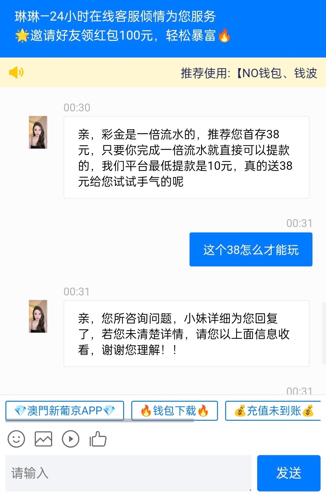 这个38,需要充值,打38的的流水才能玩这个送的38,平台最低充值10,大家自己研究下,被黑自行承担
