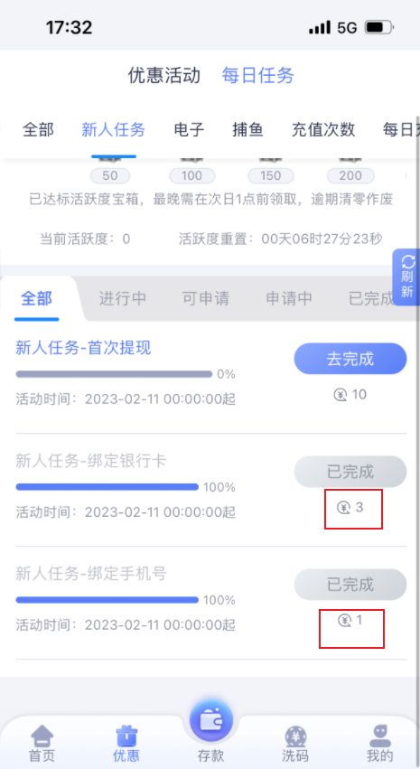注册绑卡新人任务领4