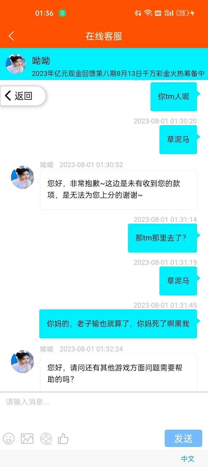这个台玩了快一年了,每天都在玩,我以为不会黑比较稳,今天0点充值第一笔用的钱能,充了900,二十分钟不到就输完了,我又用京东卡密充值500,买完就去提交,过了两分钟不到去找客服她查了一个小时后面告诉我被绑定了,不是他们绑定的没有收到,今天早上打京东客服电话说卡密在我买之后五分钟就被绑定了,也查询不到谁的账号绑定的,要查询就要报警,这垃圾平台tmd把我当傻逼打整。不管玩什么台都建议不要用卡密充值