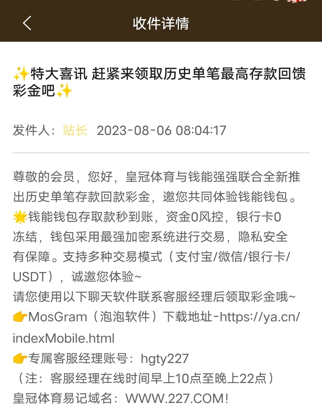 有谁收到精彩网的站内信了 可以分享一下吗