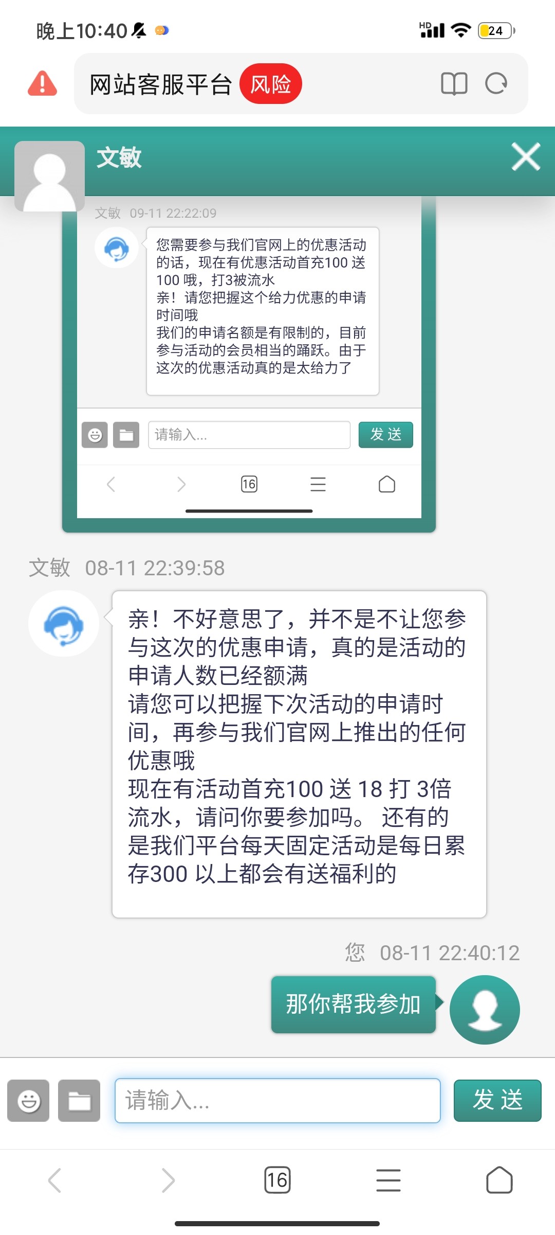 短信来的,一开始说有短信特邀彩金,后面又说没有,后面说充值100送100,充值了又说名额满了  纯纯黑台 大家避雷!!! 大家避