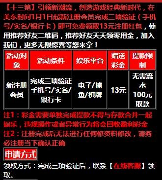 新用户注册绑卡 联系在线客服领取13元彩金 这个基本人人都送 游戏和提款限制自行询问客服