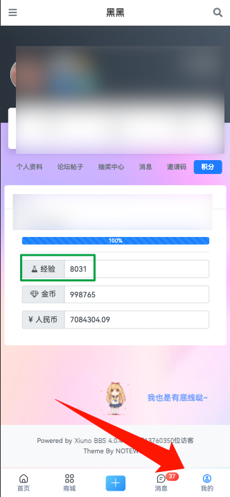 此图为经验值展示位置、签到、发贴可获取经验值