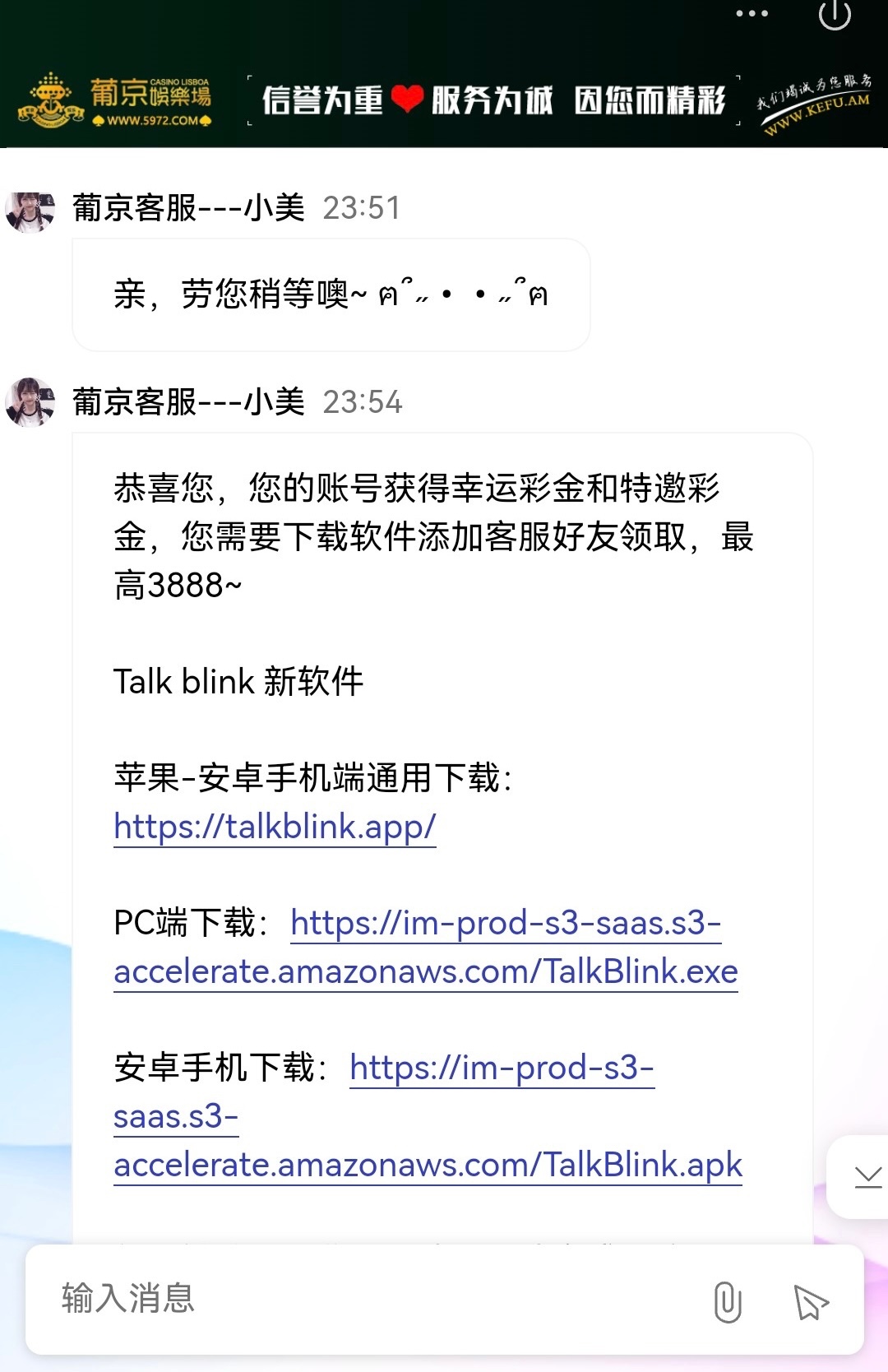 碰瓷回访,联系在线客服说电话回访彩金,另外有部分人还有登录福袋3倍流水