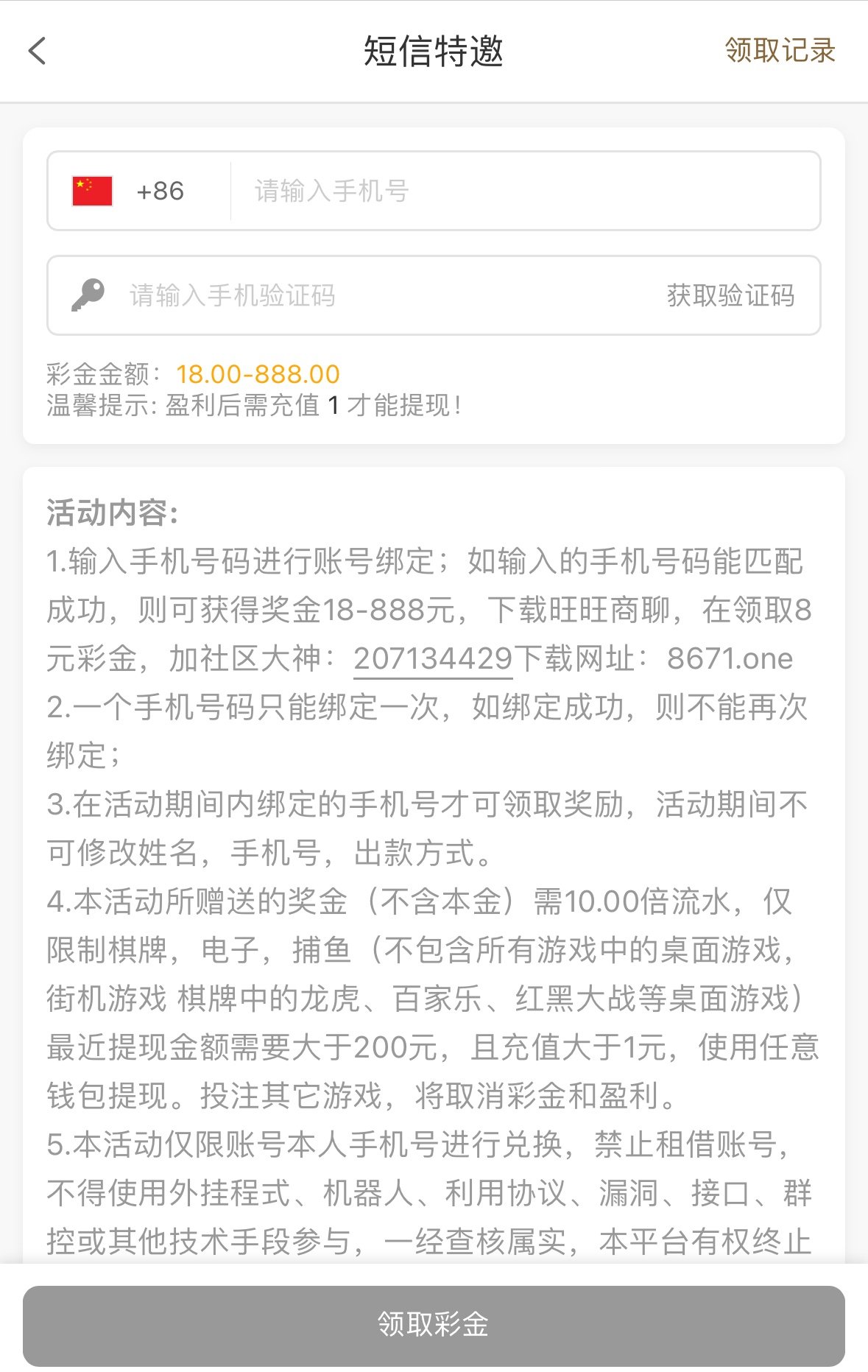 有两个特邀一个是送28限电子棋牌捕鱼10倍流水,另一个是送18彩金10倍流水同样是限制电子棋牌捕鱼盈利满200要最低充值1元+才能提现