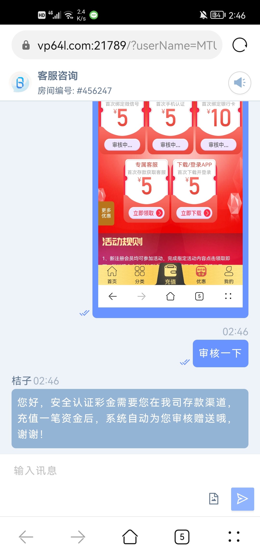 然后找在线客服审核即可,客服说要充值就换客服。彩金只能玩真人视讯。