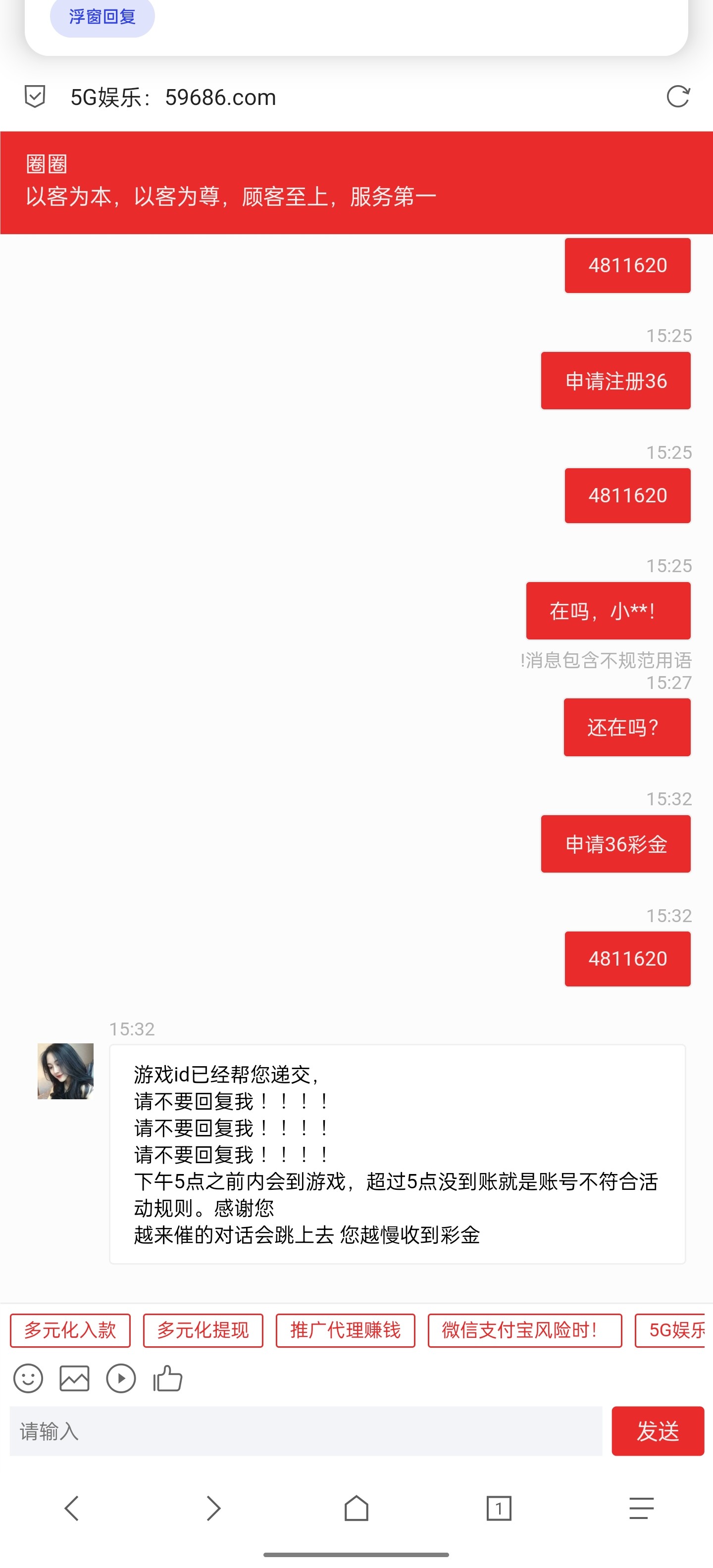 说充值没到账秒回复,他妈的哈哈哈